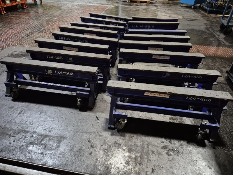 Pos. 309: 1 Zubehörpaket 5 Schubstangenwagen mit Ziehbolzen für Kopfpresse, 4 Bereitstellungswagen mit Ziehbolzen für Danly Pressen, Ablagetische, Montagewerkbank, Oberlicht, Tischwagen, Bandumreifungsgerät