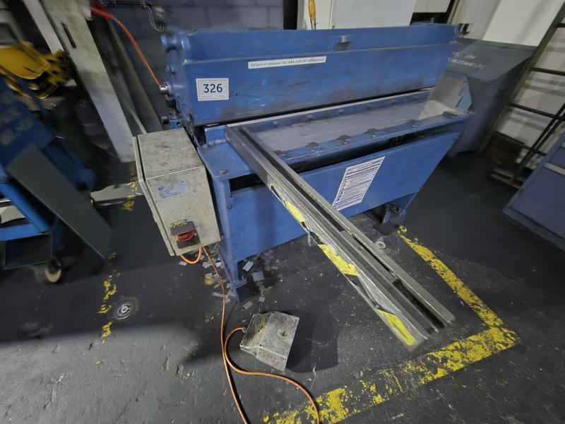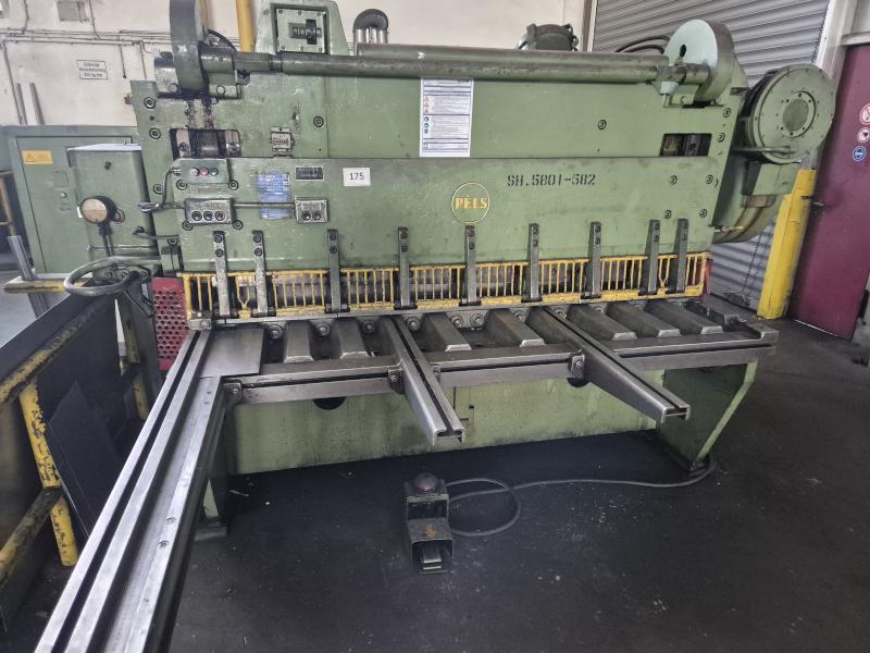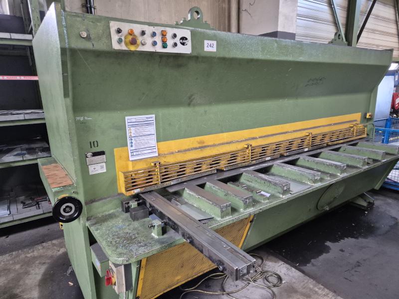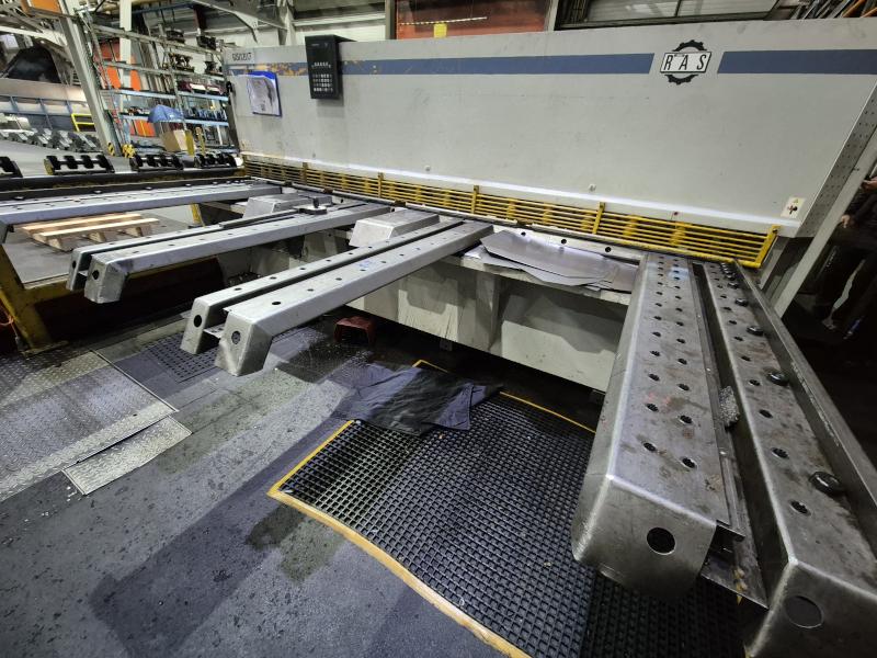 Pos. 316: 1 Schwingschnitt-Tafelschere RAS 86.33, Bj. 2002, Ser.-Nr. 27/4, Arbeitsbreite 3.190 mm, Blechstärke max. 6,3 mm, Steuerung, System 2005, für Hinteranschlag und Schnittspaltverstellung, pneumatische Blechhochhaltung, Transportband, Sicherheitslichtschranken, 4 Auflagearme vorne, 2x Fußschalter, Winkelanschlag, Platinenhubtisch, 2.000 x 2.000 mm, Anschlußleistung 18,5 kW