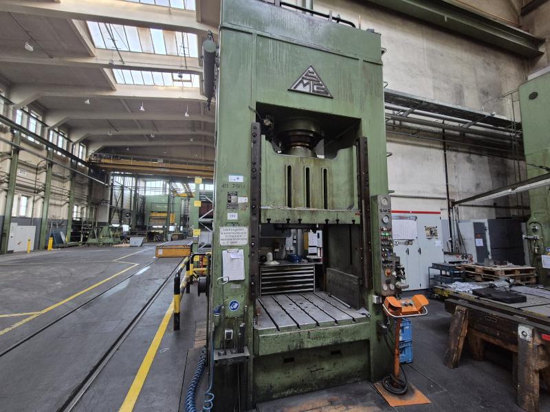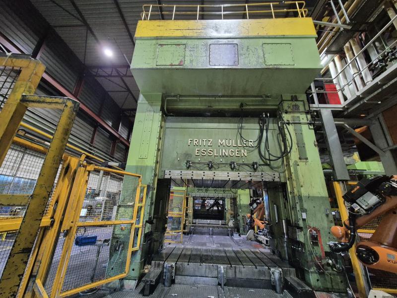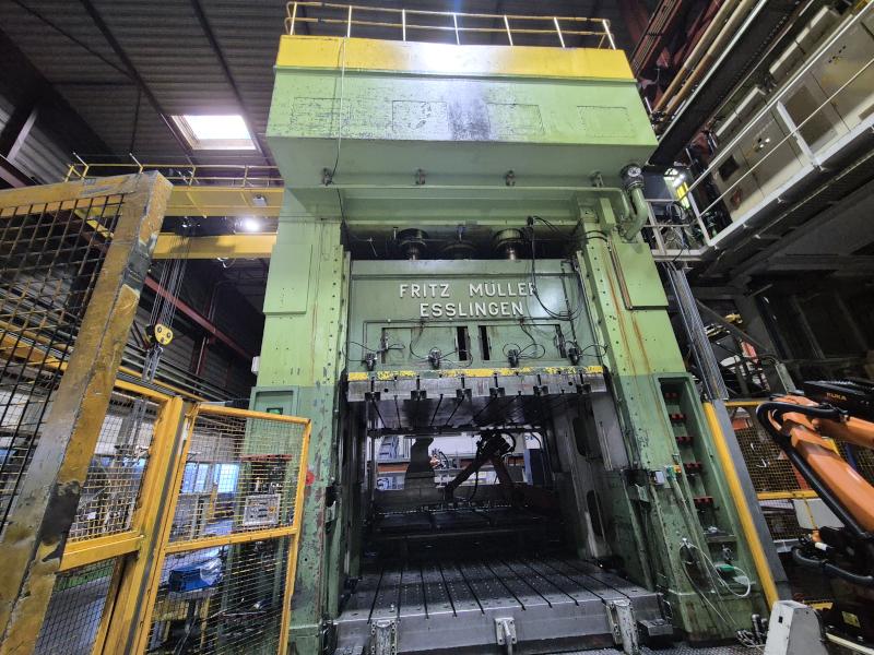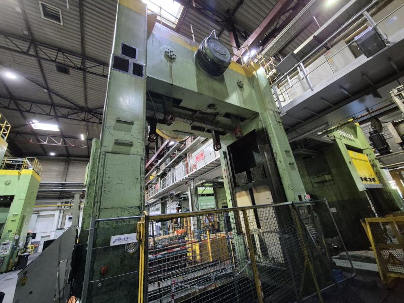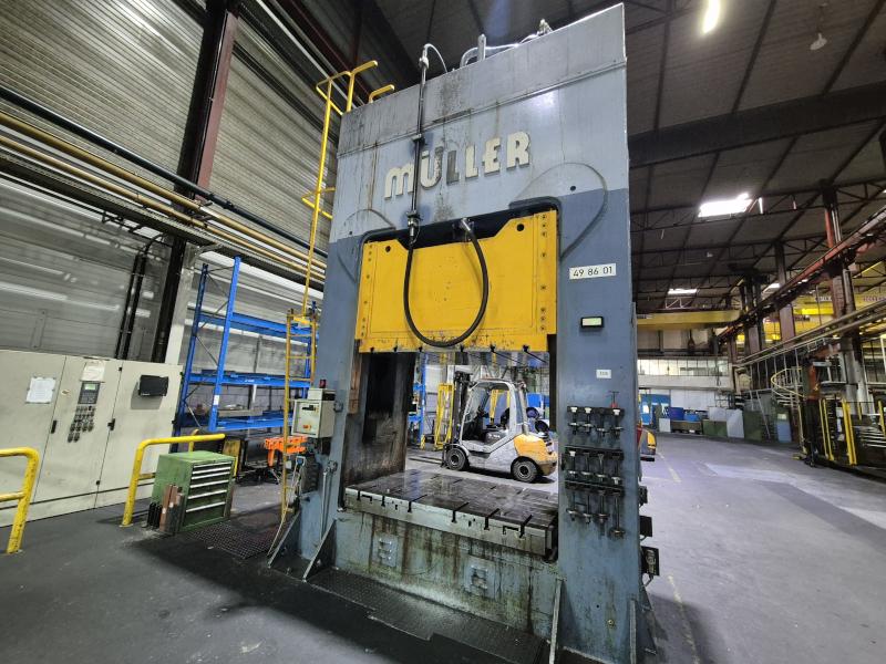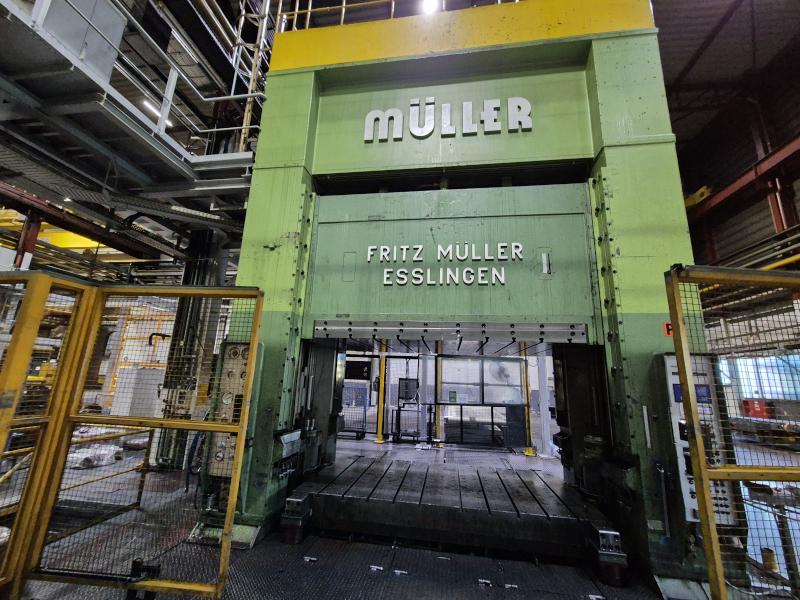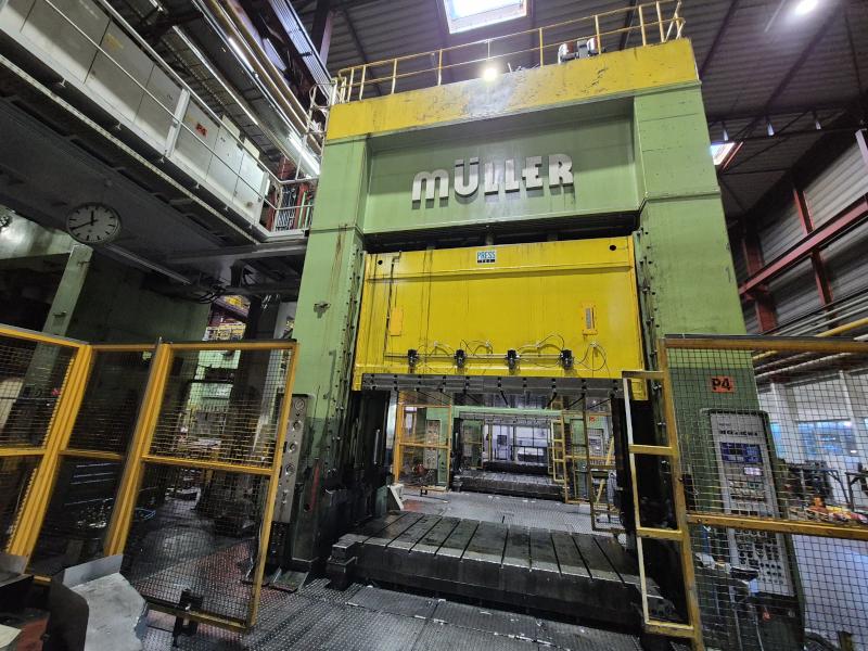 Pos. 285: 1 Doppelständer-Ziehpresse MÜLLER BZE1600-35.2.1, Bj. 1965, Ser.-Nr. 902, Druck max. 1.600 t (Stössel 1.000 t + Blechhalter 600 t; koppelbar), Schiebetisch, 3.500 x 2.750 mm, Aufspannfläche Stössel 3.500 x 2.750 mm, Stösselhub 1.400 mm, Stösselverstellung 350 mm, Druck Tischziehkissen 36 - 360 t, Hub Tischziehkissen 250 mm, hydr. Werkzeukklemmung Stössel, Pressensteuerung, Fabr. Siemens, Typ Simatic S7, Operatorpanel, Typ Simatic OP37