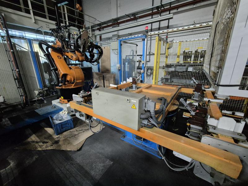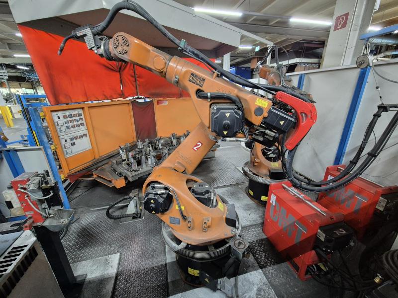 Pos. 273: 1 Montageanlage Bj. 2011, best. aus: 2 Roboter, Fabr. Kuka, Typ KR30-3, Bj. 2011, Steuerung KRC2, Handprogrammiertreminals, 2 CMT Schweißquellen, Fabr. Fronius, Typ Trans Synergic 4000, Drahtvorschubkoffer, Typ VR7000CMT, FB RCU 5000i, 2 Düsenreinigungsstationen, Wendetisch, 2 Nietstationen, Fabr. Böllhoff, Mikroprozessorsteuerung, Typ Proface, WIG-Schweißgerät, Fabr. Rehm, Typ Tiger 170 DC, Montagemanipulator, drehbar, Bereitstellungsregale, Bereitstellungspodeste