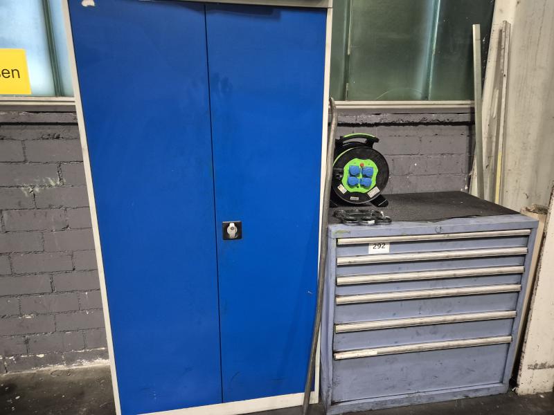 Pos. 292: 1 Zubehörpaket 3 Bereitstellungswagen mit Ziehbolzen, 1 Teleskopschubladenschrank, B 700 mm, 1 Stahlschrank 2-türig, 1 Werkbank mit Unterschrank,