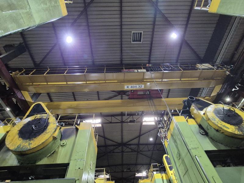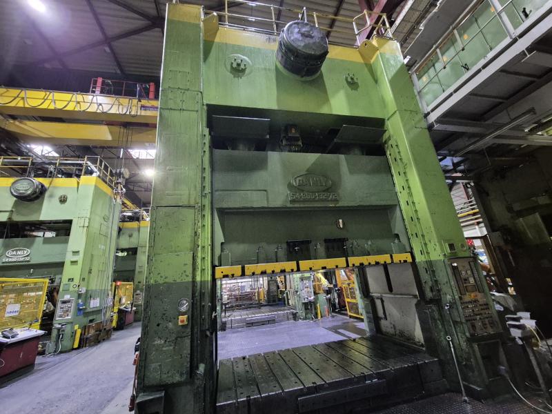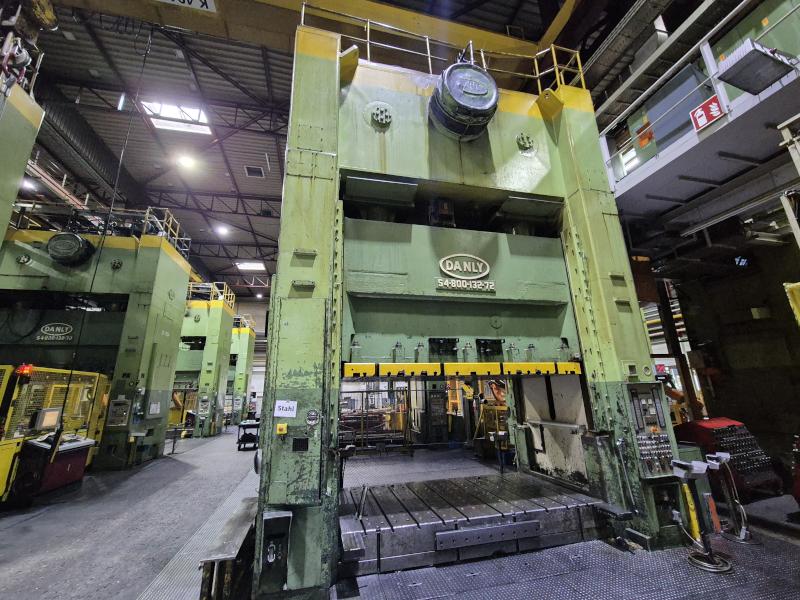 Pos. 304: 1 Doppelständer-Kurbelpresse DANLY S4-800-132-72, Bj. 1960, Druck max. 800 t, Aufspannfläche Tisch 3.350 x 1.830 mm, Aufspannfläche Stössel 3.350 x 2.100 mm, Stößelhub 610 mm, Stößelverstellung 508 mm, Hubzahl 12 - 16 Hübe/min, Schiebetisch, Druck Tischziehkissen 11 - 113 t, Tischziehkissenhub 203 mm, Stösselkissenhub 152 mm, Pressensteuerung mit Operatorpanel, Fabr. Sütron (in 2008 nachgerüstet) hydr. Werkzeugspannung oben