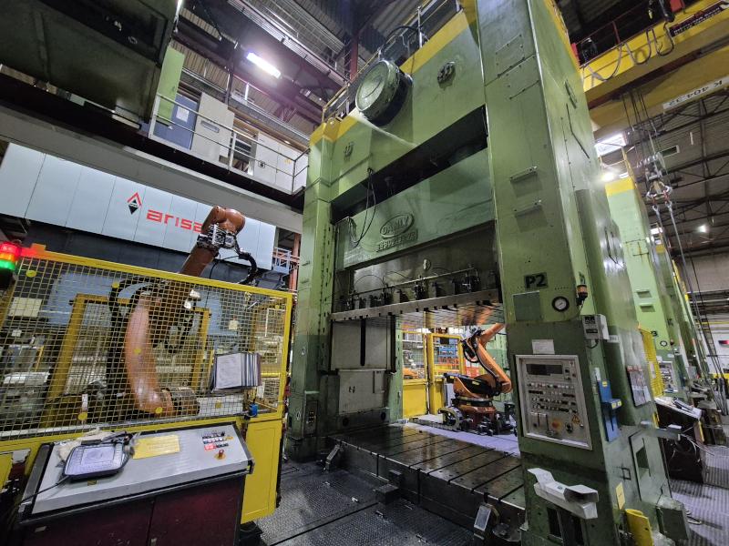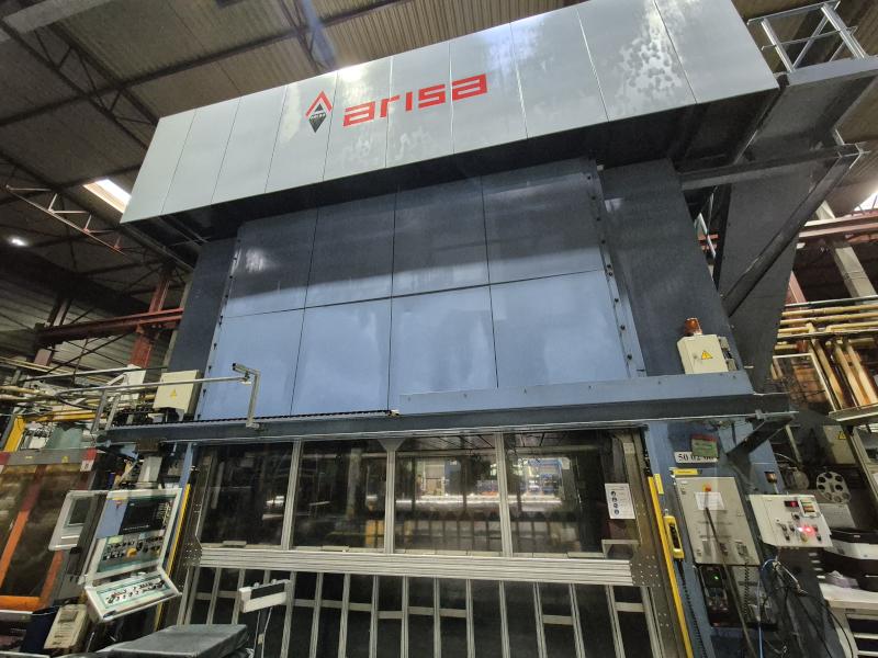 Pos. 310: 1 Transferpresse ARISA LD6-4-1600-450-230-LDE, Bj. 2002, Ser.-Nr. 816026032, Pressensteuerung, Fabr. Siemens, Typ Sinumerik 840D, Presskraft 1.600 t, Aufspannfläche Tisch 4.500 x 2.300 mm, Aufspannfläche Stössel 4.500 x 2.300 mm, Stösselhub 605 mm, Stösselverstellung 400 mm, Einbauhöhe min. 900 mm, Einbauhöhe max. 1.300 mm, Hubzahl 8 - 22 Hübe/min, Kraft Ziehkissen Tisch 2x 50-200t), Ziehkissenhub 250 mm, Kraft Ziehkissen Stössel 2x 5-55t, Stösselkissenhub 150 mm, Bandanlage, Coilgewicht max. 25t, Coilbreite 300-1.600 mm, Blechstärke 0,6-3,0 mm, best. aus Abwickelhaspel, Fabr. Cisam, Typ ASPO2000DEFCT2516, Bj. 2002, Richtapparat, Fabr. Cisam, Typ RADDRZZATRICE3000/2-9/160FC, Bj. 2002, Querschneider, Fabr. Enine, Typ CLARA, Arbeitsbreite 1.600 mm, Platinenlader, Fabr. Arisa, Bj. 2009, 2 Fahrtische, 1.700 x 950 mm, Platinenabmessung 450-1.500 x 160-800 mm, Transfersystem, Schalt- und Steuerschränke, Podestanlage mit Treppenaufgang, Förderband mit Sichtkontrolle, 4 Tageslichtlampen, 600 K, Schutzäune, Sicherheitseinrichtungen, Schnelllauftor, Ersatzteilpaket