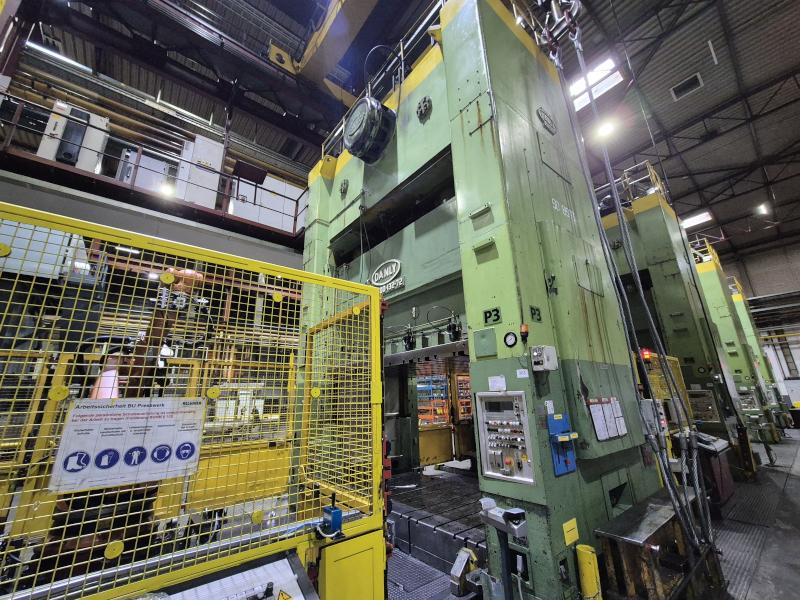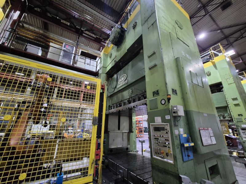 Pos. 303: 1 Doppelständer-Kurbelpresse DANLY S4-800-132-72, Bj. 1960, Druck max. 800 t, Aufspannfläche Tisch 3.350 x 1.830 mm, Aufspannfläche Stössel 3.350 x 2.100 mm, Stößelhub 610 mm, Stößelverstellung 508 mm, Hubzahl 12 - 16 Hübe/min, Schiebetisch, Druck Tischziehkissen 11 - 113 t, Tischziehkissenhub 203 mm, Stösselkissenhub 152 mm, Pressensteuerung mit Operatorpanel, Fabr. Sütron (in 2008 nachgerüstet) hydr. Werkzeugspannung oben