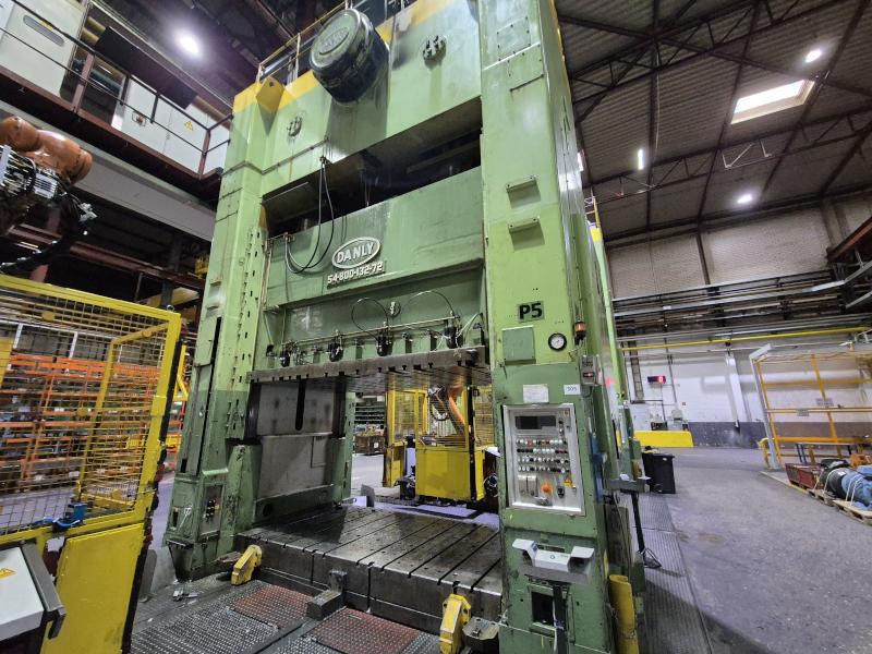 Pos. 302: 1 Doppelständer-Kurbelpresse DANLY S4-800-132-72, Bj. 1960, Druck max. 800 t, Aufspannfläche Tisch 3.350 x 1.830 mm, Aufspannfläche Stössel 3.350 x 2.100 mm, Stößelhub 610 mm, Stößelverstellung 508 mm, Hubzahl 12 - 16 Hübe/min, Schiebetisch, Druck Tischziehkissen 11 - 113 t, Tischziehkissenhub 203 mm, Stösselkissenhub 152 mm, Pressensteuerung mit Operatorpanel, Fabr. Sütron (in 2008 nachgerüstet) hydr. Werkzeugspannung oben