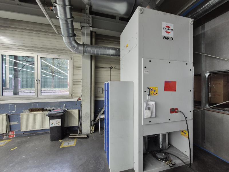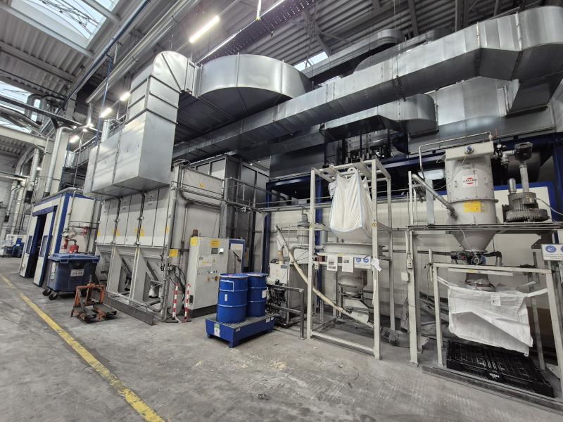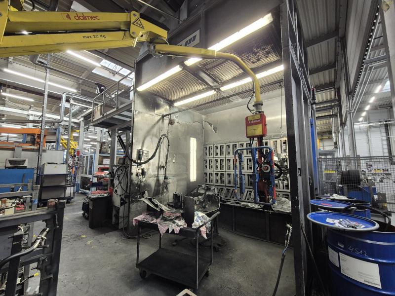 Pos. 449: 1 Dickschicht-Lackierkabine B&M Spritzstand, Bj. 2012, Ser.-Nr. 12.015, Werkstückabmessungen max. 1.500 x 300 x 500 mm, Abluftfilter mit Luftleistung 15.000 m³/Std., Handlingssystem, Fabr. Dalmec, Tragfähigkeit 20 kg (Manipulator 3), Terosonpumpe, Fabr. Atlas Copco, Dosierstation, Fabr. SCA, Manipulator, Fabr. Strödter, Abluftanlage, Fabr. Alko, Podestanlage, Schalt- und Steuerschränke, Zubehör