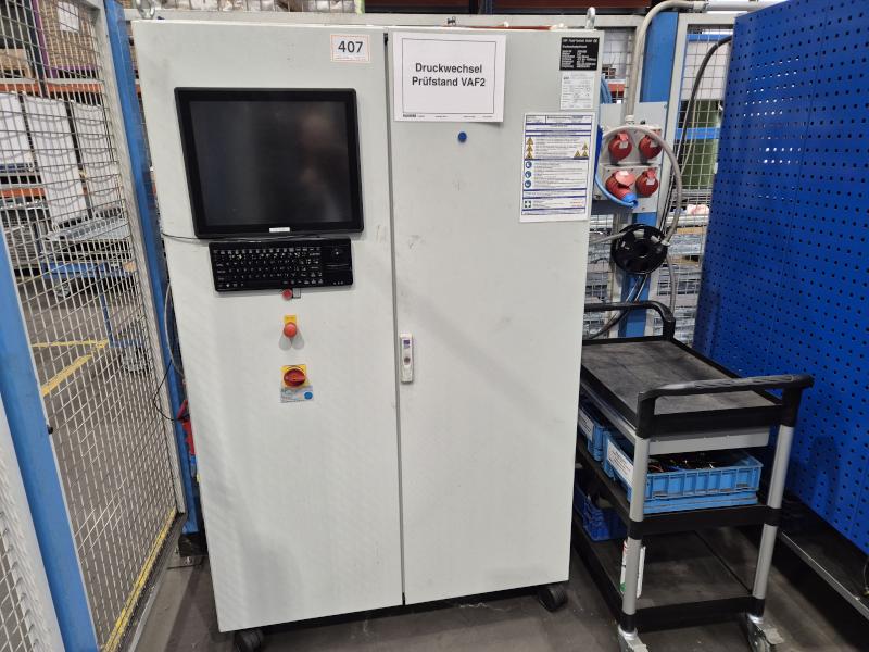 Pos. 407: 1 Druckwechselprüfstand VAF, Bj. 2019, Ser.-Nr. 009, Medium Luft, Prüfdruck -0,3 - 0,65 bar, Luftvolumen max. 30 l, PC-Steuerung, Posten Mess- und Prüfkabel, Bereitstellungsregal, Schiebetischanlage, Festo- Bauteile, Werkbank, Gefahrstoffwagen, Mess- und Prüftechnik