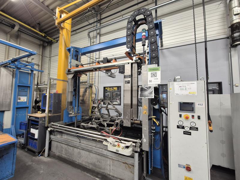 Pos. 452: 1 Dichtprüfstation MOTIVE WELDING TECHNOLOGIES, Bj. 2013, Beckengröße 2.500 x 1.500 x 600 mm, Absenkrahmen, Säulenschwenkkran, Fabr. Demag, Tragfähigkeit 500 kg, Sicherheitslichtschranken, Schalt-. Und Steuerschrank, Operatorpanel, Fabr. Siemens, Typ Simatic HMI Touch, BDE- und QS-Terminal, Bereitstellungswagen
