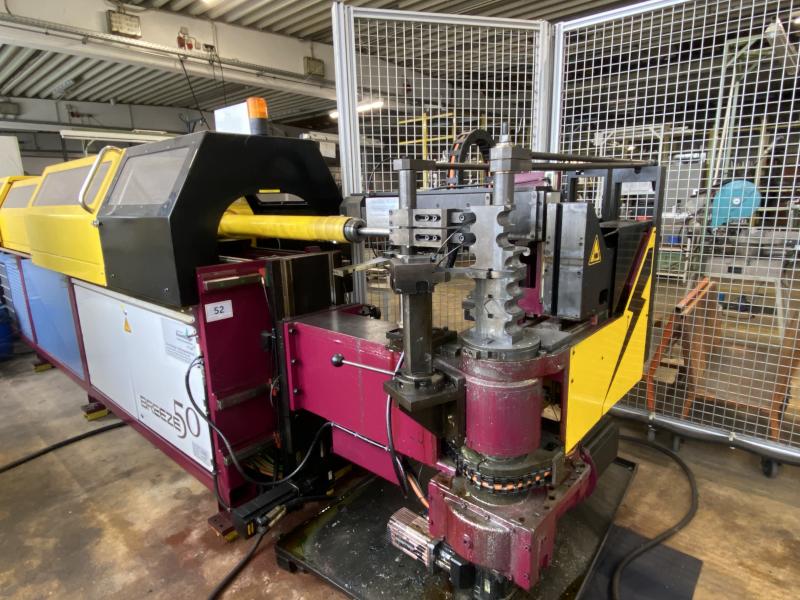Pos. 52: 1 CNC-Rohrbiegemaschine ROSENBERGER UNISON RB Breeze50, Bj. 2014, Ma.-Nr. M1322, CNC Biegekopf, Begeleistung Ø 50 x 4 mm (Stahl), Biegeebenen beliebig bis Gesamtwerkzeughöhe von 210 mm, Biegeradius 125 mm, Dorn, L 3.000 mm, SPS-Steuerung, Touch Display, Sicherheitseinrichtungen, Stahlschrank, 2-türig, Rohrentgratstation Innen/ Außen