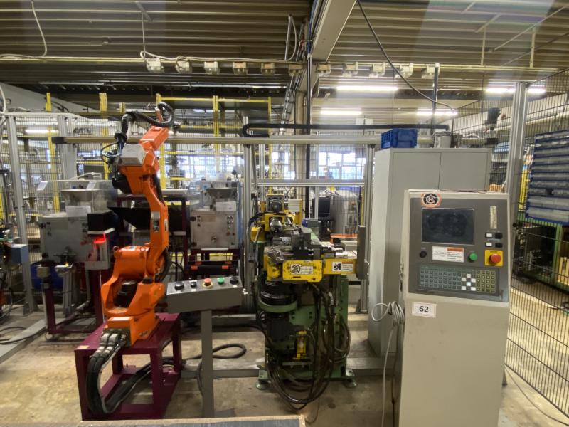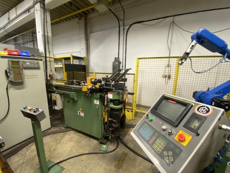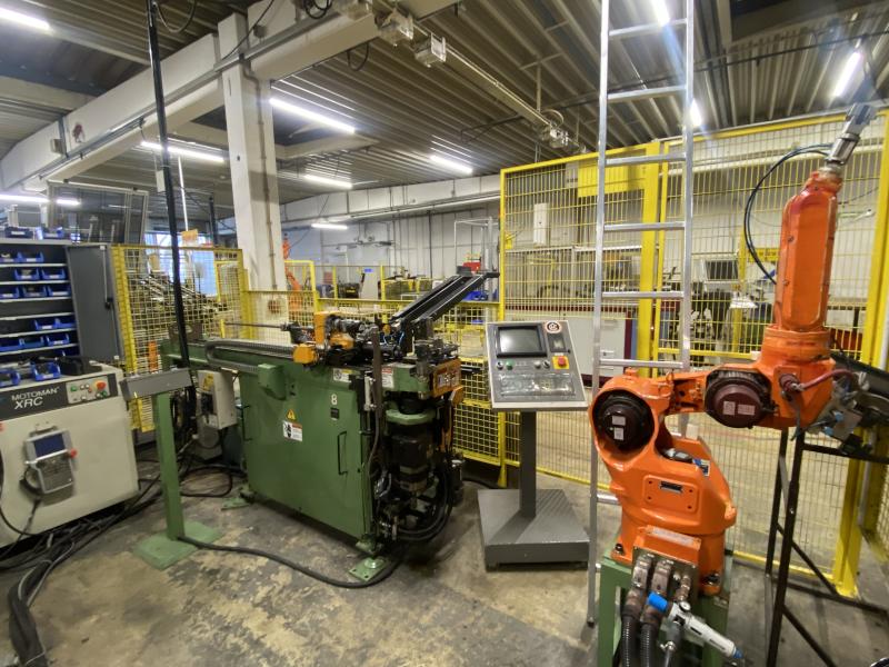 Pos. 62: 1 CNC-Dornbiegemaschine MIIC EMO-20R-S, Bj. 2001, Spannzangenkopf verfahrbar in X/Y/Z, 3 Biegeebenen, Werkstückzuführung mit Taktförderband, Be-/Entladeroboter, Fabr. Motoman, Typ ERCS-UP6-A00, Bj. 2000, Robotersteuerung XRC, Teach In-Terminal, Injetcodierer, 2x O-Ring-Montage Stationen inkl. Zuführung, Austragungstaktförderband, Messcomputer, Fabr. Innomatec, Typ LT-C602, Ausblasstation, Mosa-800/1100, Bj. 2010, Schutzzaunanlage, Statusleuchte, Anlagensteuerung mit Operator Panel, Zubehörschrank, Werkbank, 2.000 x 750 mm, Lochblechrückwand, Oberlicht