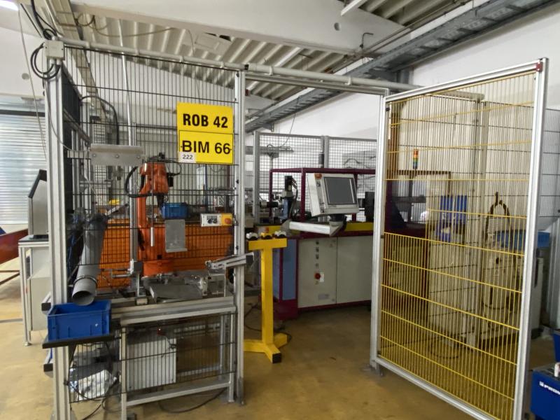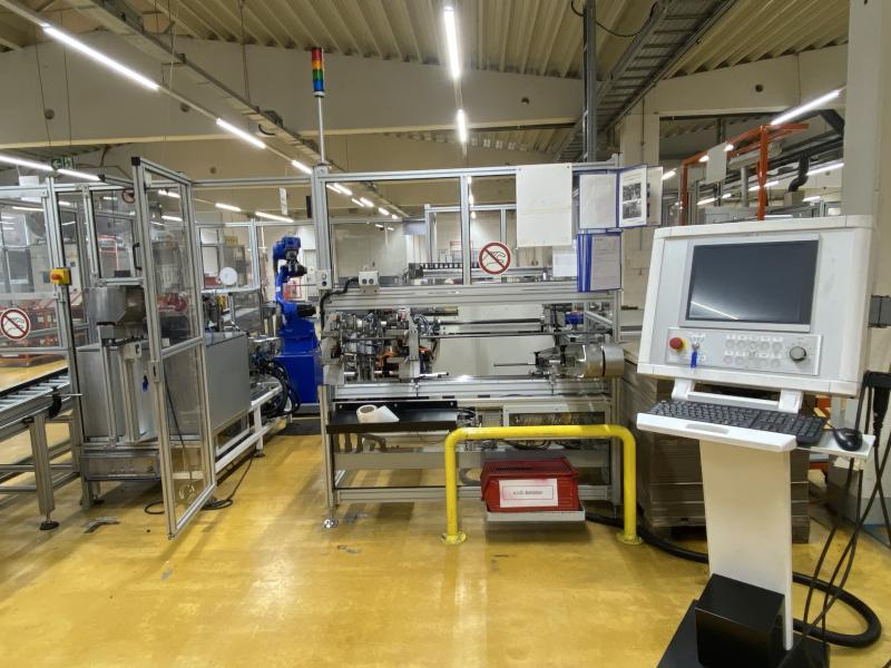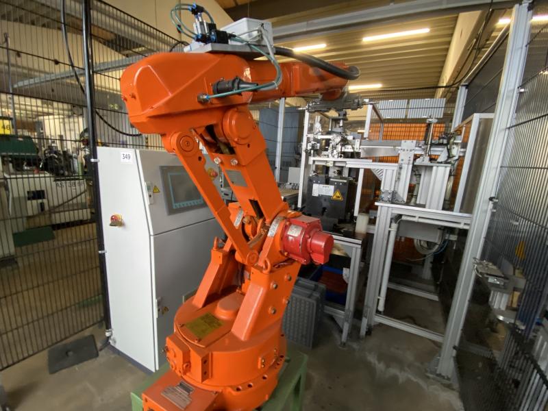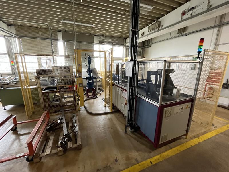 Pos. 349: 1 Endenbearbeitungszelle BÖA56" FPT, Bj. 1994, 6 Umformstationen; Zuführstation, 2x Roboter, Fabr. Motoman / FGANUC, Robotersteuerung Yasnac MRC, 2x Teach In-Terminal Inspektionseinheit, Fabr. KEYENCE, Anlagensteuerung mit Operator Panel, Fabr. Siemens, Typ SIMATIC Panel touch, Schutzzaunanlage, Werkbank, Prüfplatz mit Oberlicht, Ersatzzylinder