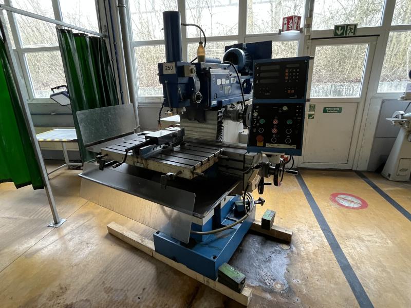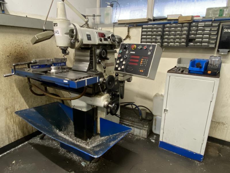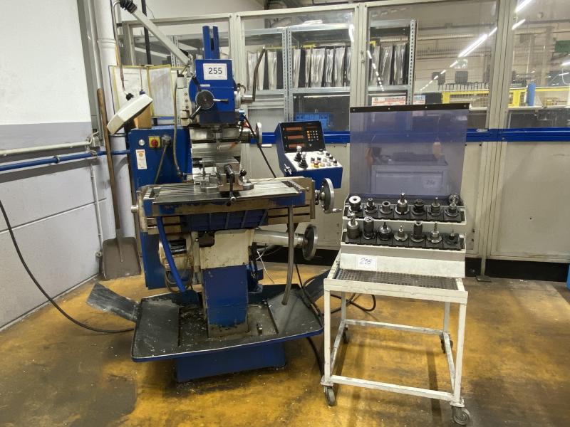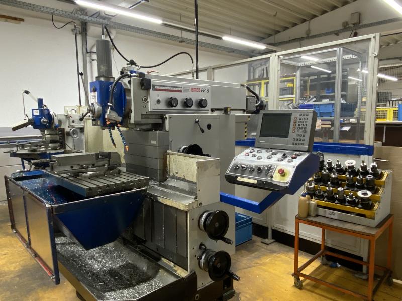 Pos. 256: 1 Universal-Werkzeugfräsmaschine EMCO FB-5, Bj. 2001, Ser.-Nr. 3-62-0102, Digitalanzeige Axesta, starrer Winkeltisch 800 x 400 mm, Verfahrweg X/Y/Z 600 x 400 x 400 mm, Drehzahl max. 3.150 U/min, Werkzeugaufnahme SK40, Kühlmitteleinrichtung, HD-Schraubstock, Stahlschrank, 1-türig, H 1.200 mm, 500 x 500 mm, WTS-Ablageregal, 17 Werkzeugaufnahmen SK40, 1x 3D-Taster