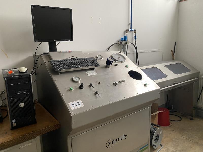 Pos. 152: 1 Druckprüfanlage ITENSIFY WPA 2000, Bj. 2012, Ser.-Nr. 2010246/12-00118, Prüfmedium Wasser, Arbeitsdruck max. 2000 bar, Edelstahl, Druck einstellbar, Testkammer B/T 1.500 x 500mm, 1x PC, Fabr. Dell, TFT-Monitor, Maus, Tastatur, Bedienstand, Werkbank, 4 Auszüge, 1x Schraubstock, Backenbreite 125mm