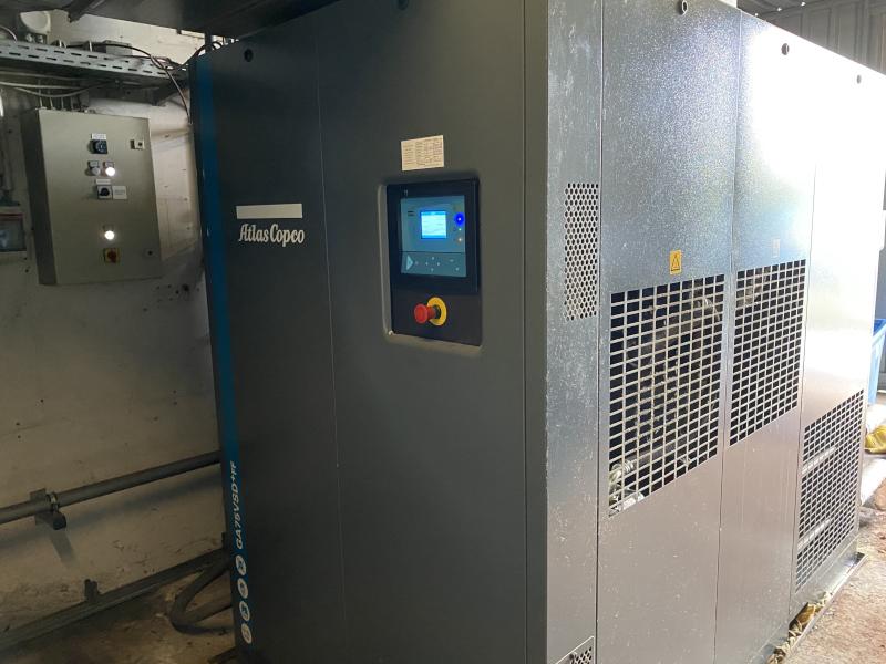 Pos. 190: 1 Schraubenkompressor ATLAS COPCO GA75VSD+FF, Bj. 2018, Ser.-Nr. 232037, Druck max. 12,75 bar, elektr. Leistung 75 kW, Kompressorsteuerung, DL-Tank, Fabr. Alup, Tankinhalt 1.500 l, Öl-Wasser-Abscheider, Fabr. Ecoair, Typ TS 16, Betr-Std. 41.872 / 40.626, spätere Freigabe nach Absprache