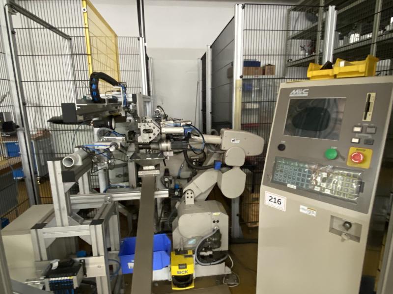 Pos. 216: 1 CNC-Dornbiegemaschine MIIC SRMIII-15R, Bj. 2004, Ser.-Nr. SR0122, Steuerung, Fabr. MiiC, Spannzangenkopf dreh- und verfahrbar, Verfahrweg X ca. 1.500 mm, Roboter-Biegekopf, Kleinteile-Zuführanlage mit Vibrationsfördertopf, Vereinzelung, Teilerutsche, Gurtförderband, Schutzzaunanlage, Sicherheitslichtschranken, Schalt-/Steuerschränke