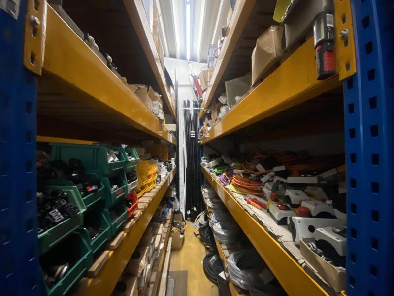Pos. 229: 1 Ersatzteillager 2 Rauminhalte "Lager 2/ Lager 3": Regale 5 - 7 Ebenen, 2 Klappleitern, Stahlschrank, 2-türig, Lagersichtkästchen, Inhalt: Elektrische, Mechanische, Pneumatische Komponenten (teilw. Originalverpackt) ***Zwischenverkauf vorbehalten***