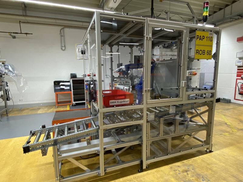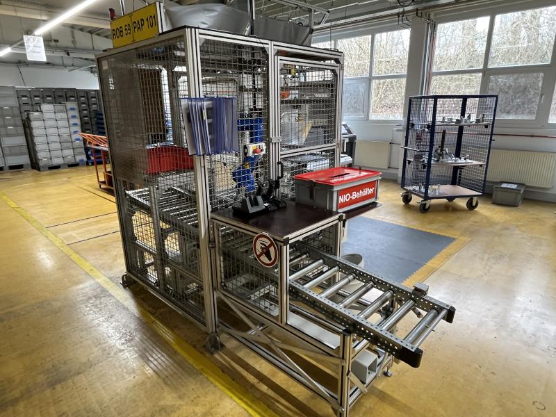 Pos. 233: 1 Prüf- und Packstation Bj. 2021, Kamerastation, Roboter, Fabr. Yaskawa, Typ YR1, Robotersteuerung, Ersas-1000-06VX8, Teach In-Terminal, Kabine, Kistenaustragungs-Rollbahn