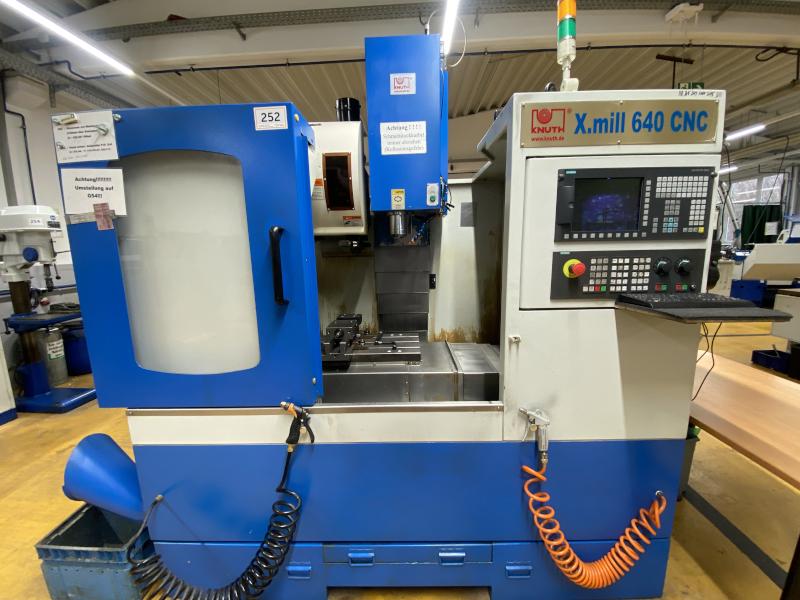 Pos. 252: 1 CNC-Vertikal-Bearbeitungszentrum KNUTH X.mill 640 CNC, Bj. 2014, Ser.-Nr. 158605, Steuerung, Fabr. Siemens, Typ SINUMERIK 828D, NC-Teilapparat (4. Achse), Aufspanntisch 750 x 360 mm, Verfahrweg X/Y/Z 640 x 400 x 500 mm, Drehzahl max. 8.000 U/min, Werkzeugwechsler 16-fach, Werkzeugaufnahme BT 40, HD-Schraubstock, Kühlmitteleinrichtung, Späneförderer, Schaltschrank, Werkbank mit Schraubstock, B/T/H 1.400 x 600 x 1.000 mm, 2 Auszüge, 2 Türelemente, Schubladenschrank, 3 Schubladen, Klapptür, Fabr. Bedrunka + Hirth, B/T/H 800 x 900 x 1.200 mm, Inhalt: ca. 30 Werkzeugaufnahmen BT40, 1 Posten Fräswerkzeuge, Dreibackenfutter, 1 Posten Spannzangen