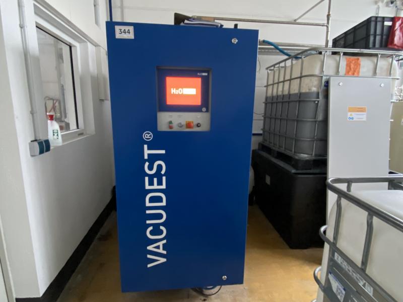 Pos. 344: 1 Vakuum-Destillationssystem H2O Vacudest XS Clearcat, Bj. 2023, Aufbereitungsleistung max. 300 cbm/ Jahr, Maschinensteuerung, touch Display Vacutouch, 5 IBC Tanks, 3 IBC Auffangwannen, Fabr. CHEMO, Bj. 2023, Inhalt 1.100l, CIP Anlage, Rohrleitungen, Pumpe, Betriebsstunden 4.868