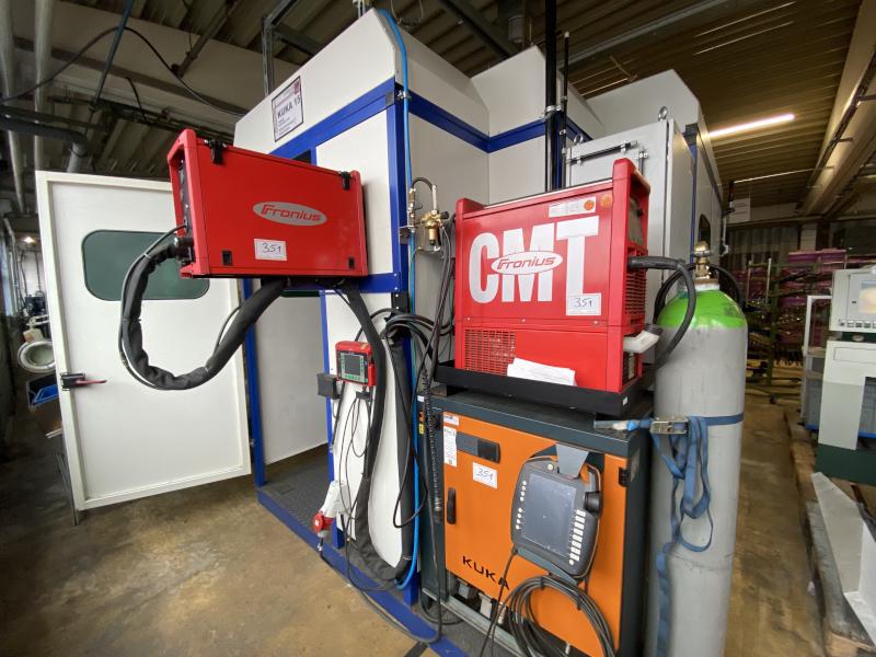 Pos. 351: 1 Schweißzelle PAUL VON DER BANK GMBH Roboterschweißanlage, Bj. 2013, Ser.-Nr. 13.536, Schweißquelle, Fabr. Fronius, Typ CM TransPuls Synergic 4000, Kühlgerät, Schweißeinheit VR7000CMT, Programmierterminal RCU5000I, Wendetisch, Schweißroboter, Fabr. KUKA, Typ KR5-2ARC, Robotersteuerung KRC4, Absaugung, Fabr. Plymovent - Anlage nicht angeschlossen