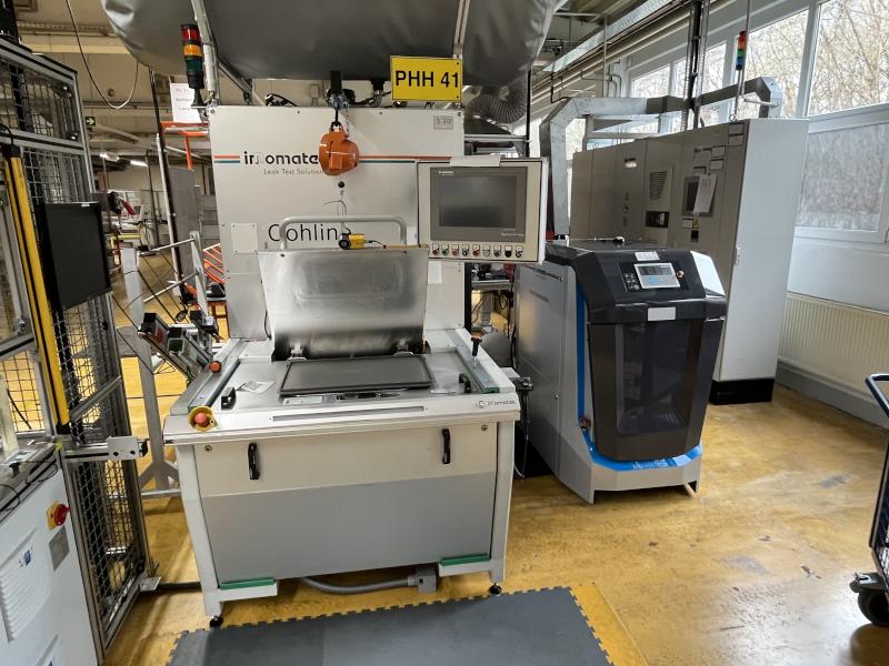 Pos. 232: 1 Helium-Dichtprüfanlage INNOMATEC HLM250/3000, Bj. 2017, Ser.-Nr. P44540, PC-Steuerung, Fabr. Innomatec, Touchdisplay, Prozesskammer, Verdichterstation, Peripherieaggregate, Kistenbereitstellungs-Rollwagen, Etikettensdrucker cab eos2