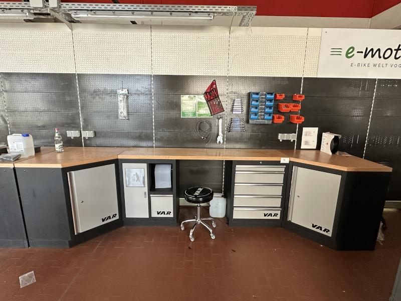 Pos. 15: 1 Werkbankzeile VAR, Bj. 2022, ca. 4.000 mm, li/re Schubladenschränke, je 7 Züge, 2 Eckschränke, je Flügeltür, Schrauberstock Fab. Meister, Backenbreite 150 mm, Zentrierständer Fab. Cyclus Tools, 2 Kleinsortimentschränke, Rollhocker