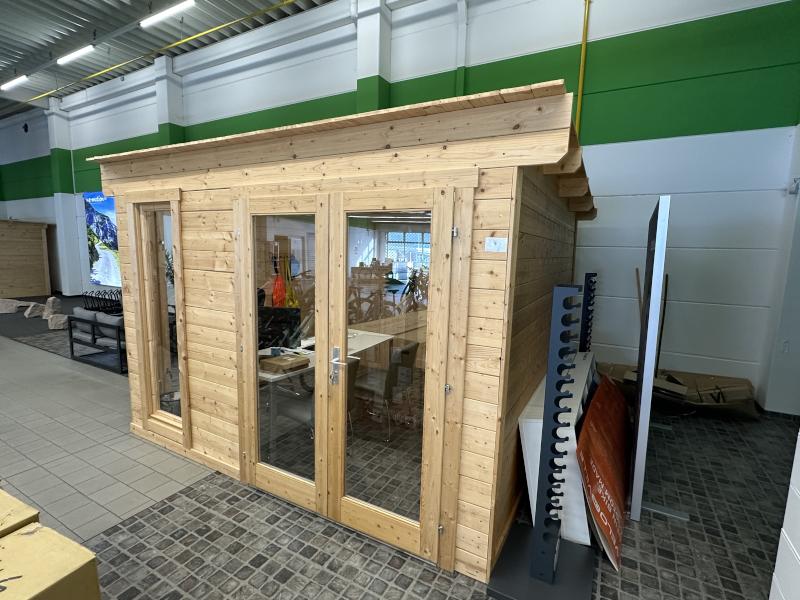 Pos. 4: 1 Gartenhaus 1 GARTENHAUS Aldo-28A, Bj. 2022, 13.54 m², Flachdach, Maße ca. 3.200x3.200x 2.300 mm, 2 Glaselemente, Eingangstür verglast, Inhalt: Schreibtisch, Bürodrehstuhl schwarz, 2 Stühle Chromuntergestell, Kunstleder grau, Highboard, 2 Flügeltüren, Eiche hell, Natursteinheizplatte Wandanbringung