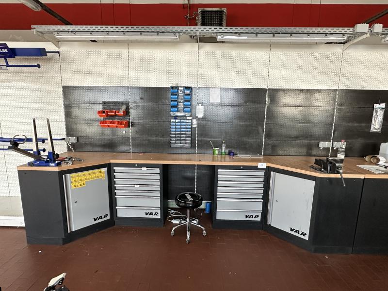 Pos. 15: 1 Werkbankzeile VAR, Bj. 2022, ca. 4.000 mm, li/re Schubladenschränke, je 7 Züge, 2 Eckschränke, je Flügeltür, Schrauberstock Fab. Meister, Backenbreite 150 mm, Zentrierständer Fab. Cyclus Tools, 2 Kleinsortimentschränke, Rollhocker
