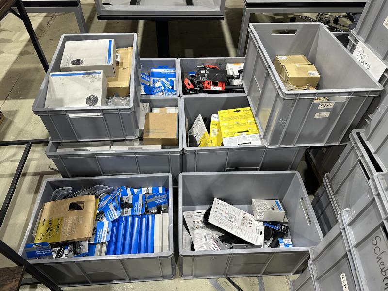 Pos. 19: 1 Posten Ersatzteile für Fahrradaufbereitungen/-reparatur best. aus Reifen, Schläuchen, Bremsscheiben, Bremsbelägen, Ketten, Akkus, Ladegeräten etc.,