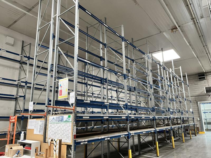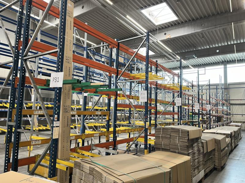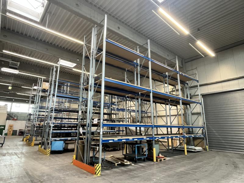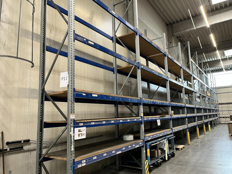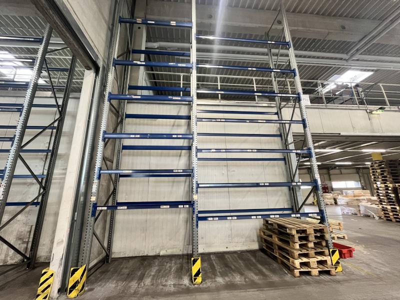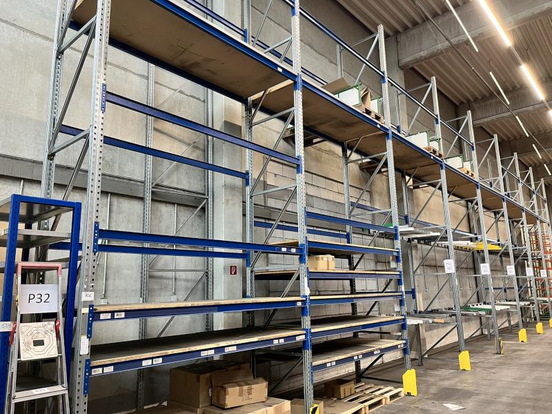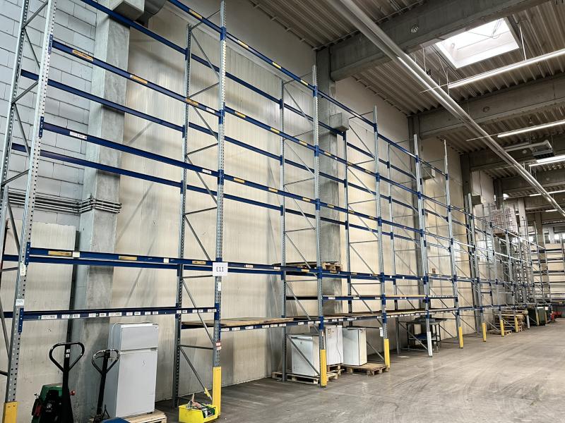 Pos. 708: 1 Schwerlastregal SSI SCHÄFER PR600, Bj. ca. 2000, 26 Elemente, B/T/H 2.700 / 3.300 x 1.100 x 6.000 mm, 4 - 6 Ebenen, Fachlast 1.140 / 1.950 kg, Feldlast 7.800 / 8.000 kg, 9 Langgutanstellsektionen, Fachlast 900 kg, Feldlast 3.600 kg, Trenn-/Sortierbügel, Anfahrschutz, ohne Inhalt