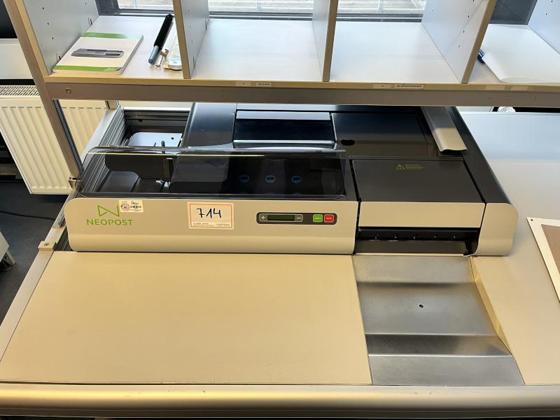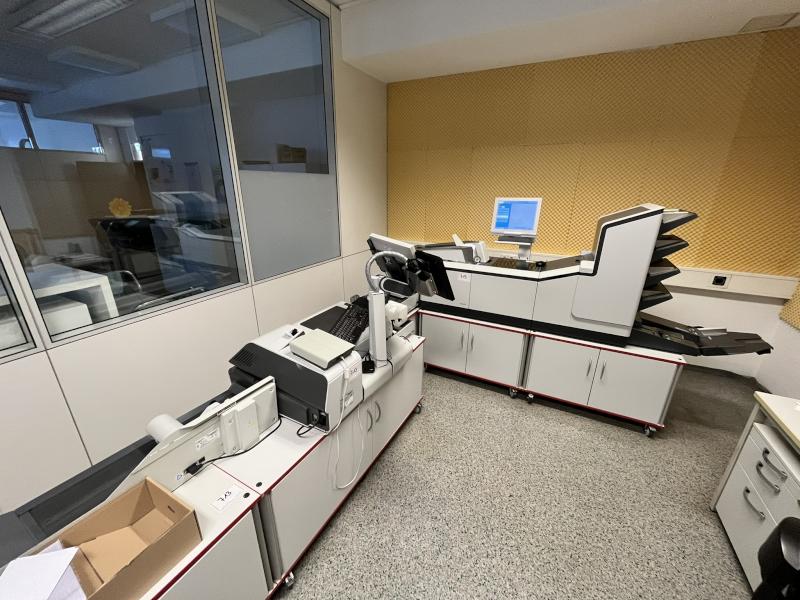 Pos. 713: 1 Kuvertiersystem NEOPOST DS-200, Bj. 2018, Ser.-Nr. SBQ1240, best. aus: Frankiermaschine, Typ IS-6000, Ser.-Nr. MA1749000752, Steuerung, Tranpostbandstapler, 3x Unterbauschrank, je 2-türig