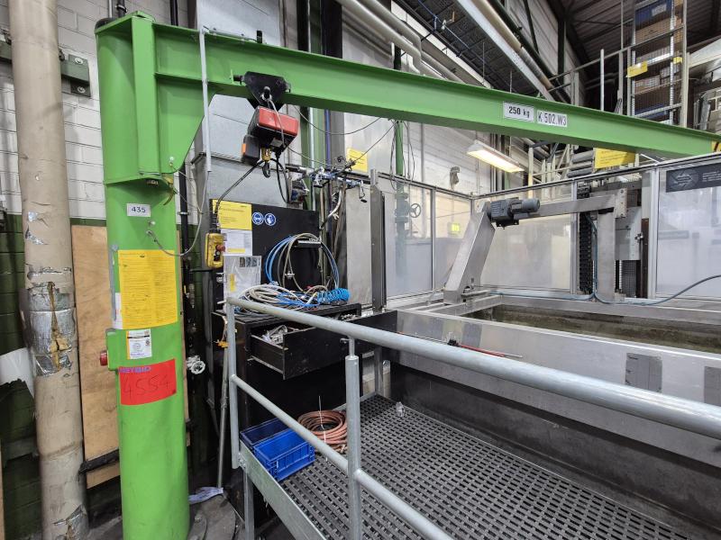 Lot 452: 1 Leak Test Station KB BR222/217 ECE USA MOTIVE WELDING TECHNOLOGIES, YOM 2013, Tank size 2,500 x 1,500 x 600 mm, lowering frame, column-mounted slewing crane, manufacturer Demag, load capacity 500 kg, safety light curtains, switch and control cabinet, operator panel, manufacturer Siemens, type Simatic HMI Touch, BDE and QS terminal, provision cart