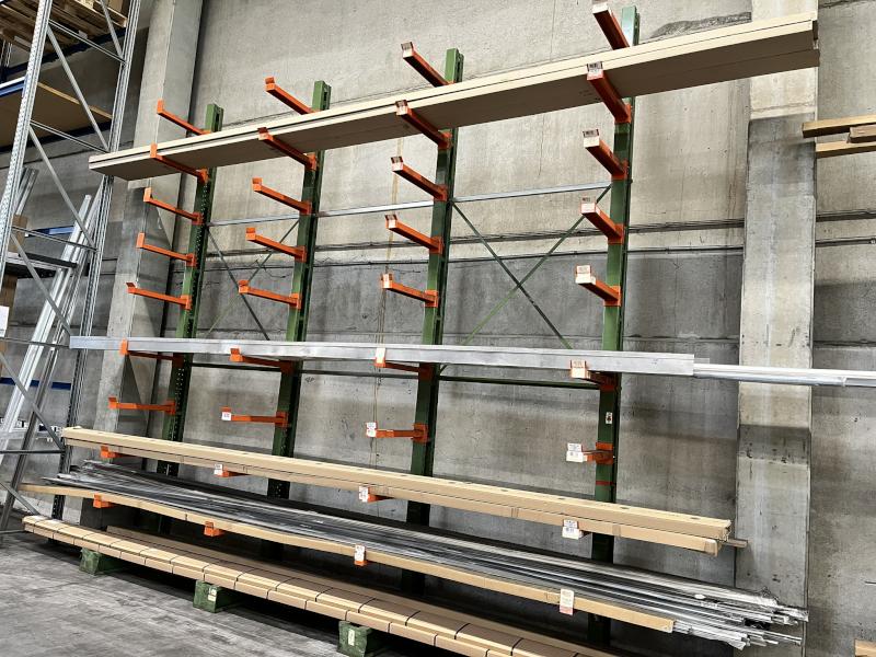Lot 610: 1 Cantilever Racking FISCHER, YOM 2013, consisting of: 5 cantilever racks, cantilever length 1,000 mm, 5 levels, rack height approx. 6,000 mm, cantilever load 300 kg, rack load 1,800 kg, blue/orange, incl. 1 item of cantilever rack approx. 14 pcs., 1 set of bracing, next inspection 7/26, without contents