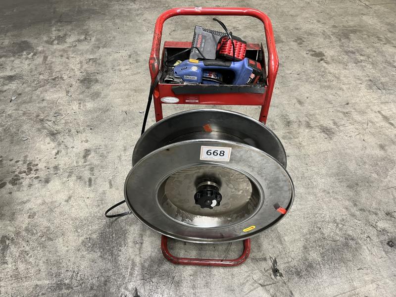Lot 636: 1 Semi-automatic Bandaging Machine FROMM PM309, YOM 2008, Machine no. 80907236, passage approx. 850 x 600 mm, compatible strap width approx. 8 - 12 mm, adjustable tension approx. 70 - 450 N, strapping speed approx. 2.1 s / strapping, feed roller conveyor