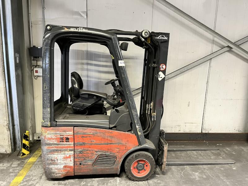 Lot 679: 1 Electric Forklift Truck LINDE E18L-01, YOM 2010, Serial no. H2X386A04196, max. load capacity 1,800 kg, duplex mast, max. lift height 4,625 mm, hydraulic fork adjustment, hydraulic side shift, operating hours 12,386, charger
