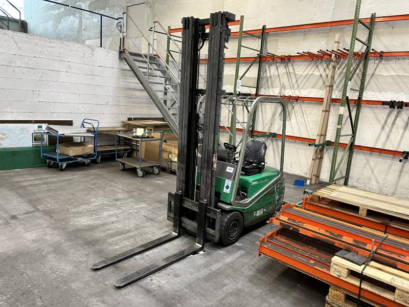 Lot 673: 1 Electric Forklift Truck CESAB Blitz 315, YOM 2000, Serial no. 181761, max. load capacity 1,500 kg, triplex mast, lift height approx. 5,000 mm, manual fork adjustment, hydraulic side shift, operating hours 52,638, charger