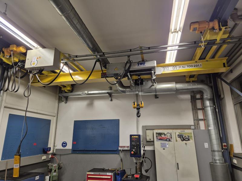 KWG, K310.01, Tragfähigkeit max. 1,6 t, Spannweite 5 m, Laufkatze Fabr. SWF