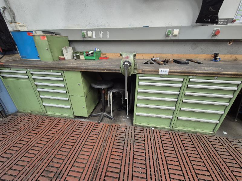 L 7.000 mm, 8 Unterschränke, 3 Schraubstöcke, 3 Schubladenschränke B 500 - 1.000 mm, 5-7 Auszüge