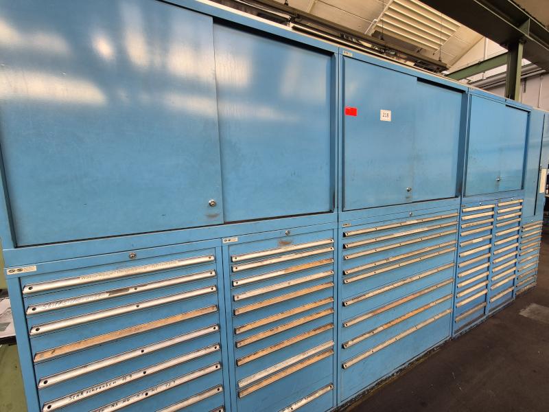 LISTA, B 720-1.000 mm, 9-11 Auszüge, 3 Schiebetürenschränke, Fabr. Dick Lista, Inhalt: Normteile, Schnellkupplungen Parker, Verbrauchsmittel, 11 elektr. Handmaschinen, Schleifmittel, Messmittel, Passstifte