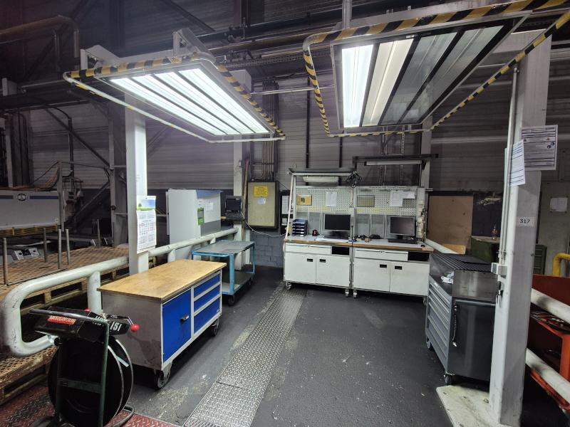 2x Oberlicht 6000 K, 2 Montage-Rolltische mit Unterschrank + Oberlicht, 1 Werkzeugcontainer B 500 mm, 5 Auszüge, 1 Bandumreifungsgerät Signode, Stahlbandabroller, mobile Kleinwerkbank mit Unterschrank