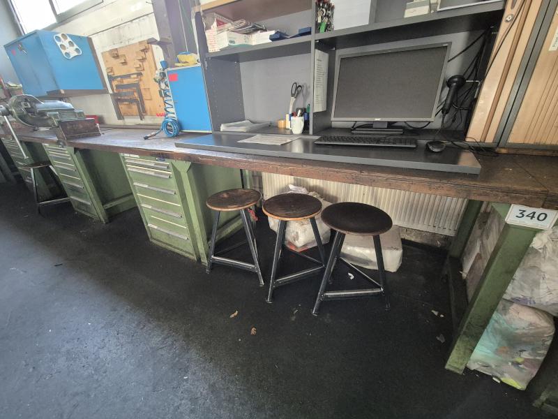 7 Unterschränke, Fabr. Garant, B 560 mm, 5 Auszüge, 2 Schraubstöcke, Fabr. Leinen, 2 Werkzeugmontagetische, 2.000 x 1.250 mm, 6 Kabeltrommeln, 220/280 kV