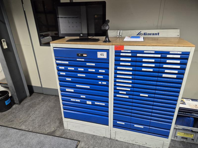 GARANT, best. aus: 2 Schubladenschränke, Metall, 11 / 54 Auszüge, Inhalt: Fräswerkzeug-Zubehör, u.a. Rundplatten-Fräsköpfe POKOLM, Wendeschneidplatten, Fräswerkzeuge System Mitsubishi / Walther / Bilz, OSG-Phoenix, VHM Bohrer Ø 4-20 mm, Verlängerungen und Aufsteckfräser System POKOLM (Ausgabesystem benötigt nach Cyber Angriff neue Software)