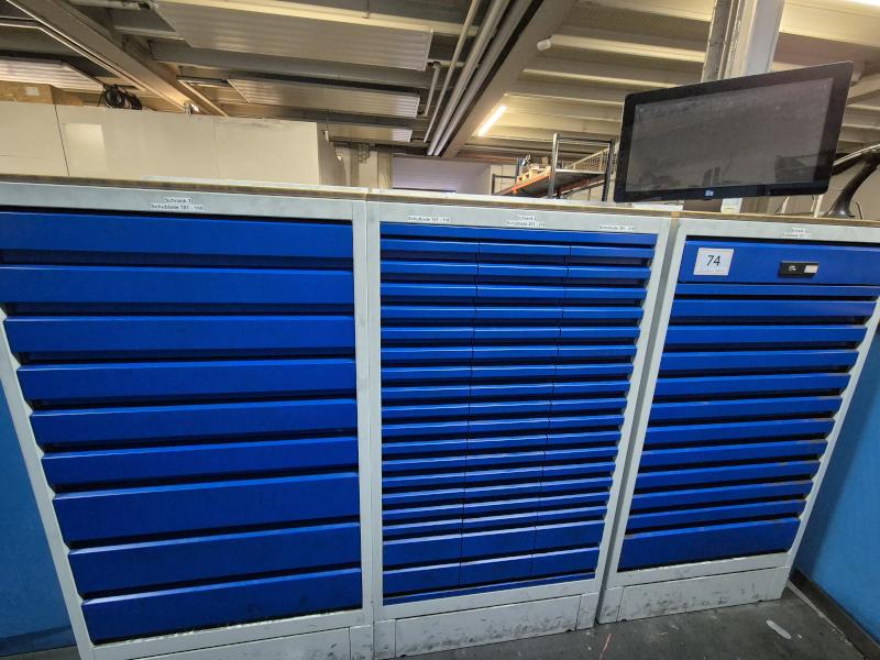 GARANT, best. aus: 3 Schubladenschränke, Metall, 9, 11, 54 Auszüge, Inhalt: Verbrauchsmittel, Feilen, Gabelschlüssel, Spiralbohrer, Steinbohrer (Ausgabesystem benötigt nach Cyber Angriff neues Software)