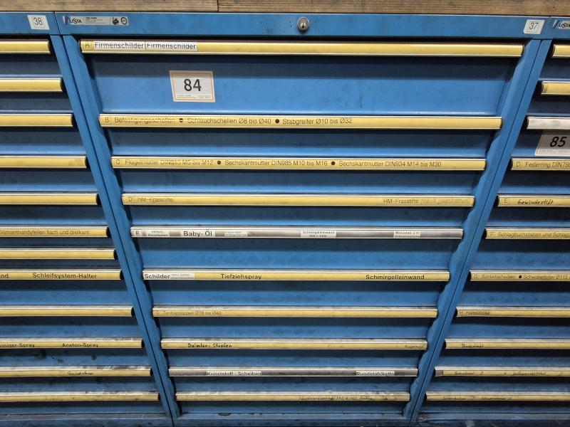 LISTA, B 1.000 mm, 10 Auszüge, Inhalt: Befestigungsschellen, Flügelmuttern, HM Frässtifte, Batterien, Tiefziehspray, Zentrierpuppen, Kunststoff-Stopfen