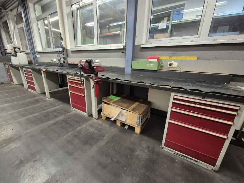Holz/Metall, L 7.000 mm, 1 Schraubstock Leinen, 4 Schubladenschränke