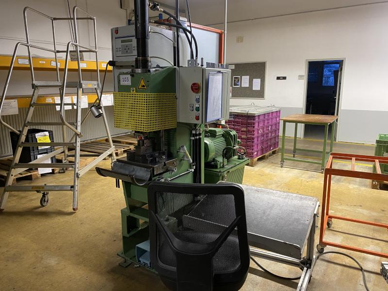 UNIMA, Bj. 2005, Ser.-Nr. 400603, C-Ständer, Druck max. 160 kN, Hydraulikaggregat, Schalt-/Steuerschrank, Operator Panel, Fabr. Magelis, Maschinenbeleuchtung, Industriedrehstuhl, Bereitstellungsregale für Kisten