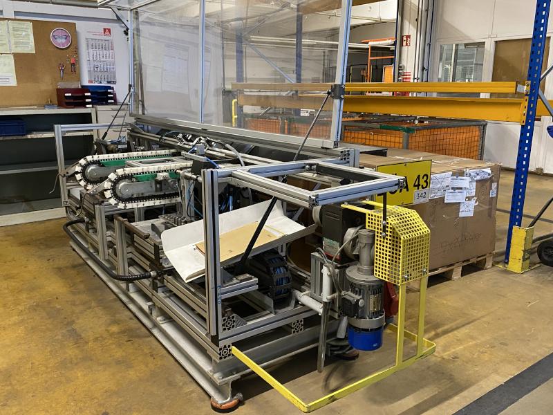 2 Bördelstationen, Transport über Kette, Anschlag, Greifer, Schalt- und Steuerschrank, Gestell aus Alu-Systemprofilen, Schutzhaube